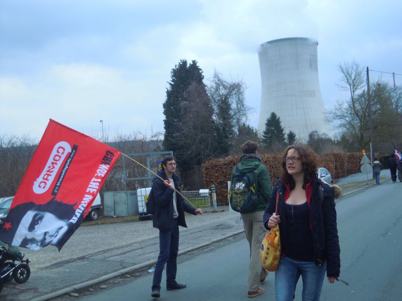 Deze en nog meer slogans werden geroepen en gezongen op de ongeveer 5 km lange mars van Hoei naar Tihange.